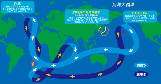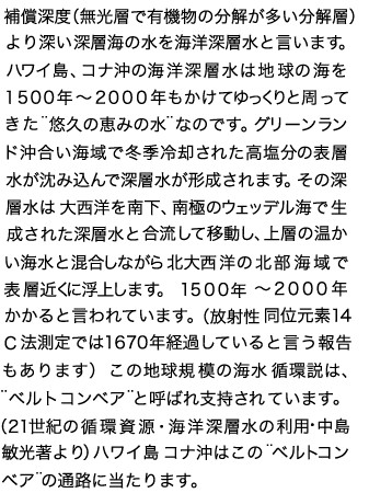 そしてゆっくりと海底を這うようにして海洋大循環の流れに乗り、 インド洋・太平洋を流れまさに2000年もの月日をかけてハワイ島コナ沖で一気に 湧き上がります。それを海面から915mもの深層にパイプを入れ取水しているので、 産業排水・生活排水・大気汚染等に汚染されていない、尚且つミネラル豊富な 深層水ができ、私達はそれを得る事ができるのです。それに比べ、日本近海の深層水は (上の図を見て頂けば分かる通り)海洋大循環の流れに乗っていない、 数十年〜百年くらいの循環によるものだと考えられています。