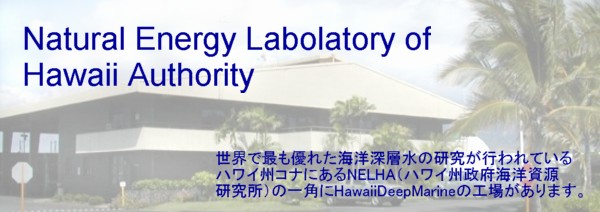 | NELHA とは? Natural Energy Laboratory of Hawaii Authority の略です。 日本語に訳すと、「ハワイ州立自然エネルギー研究所」のこと を意味します。 海洋資源(主に海水)を利用した電力発電の研究を行うために アメリカ連邦政府によって設立されました。 しかし、研究の結果、海洋資源のひとつである海洋深層水は、 発電のみならず様々な用途に使えることがわかってきました。 現在では、世界で最も進んだ海洋深層水研究機関として 知られています。 |